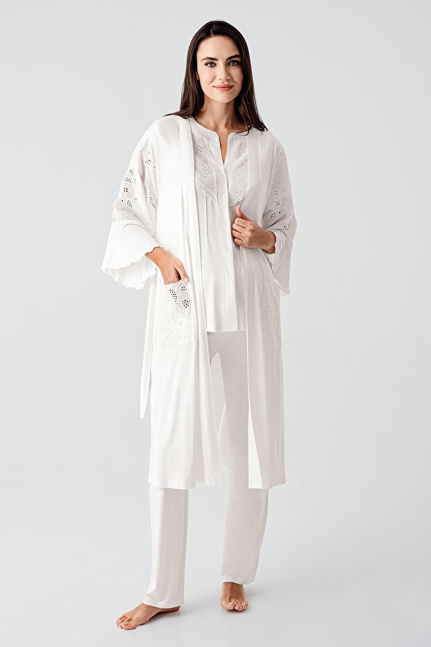 Rahat hareket edebilmeniz için tasarlanmış kısa kollu ve düğmeli vual detaylı esnek viskoz hamile sabahlık pijama takımı.