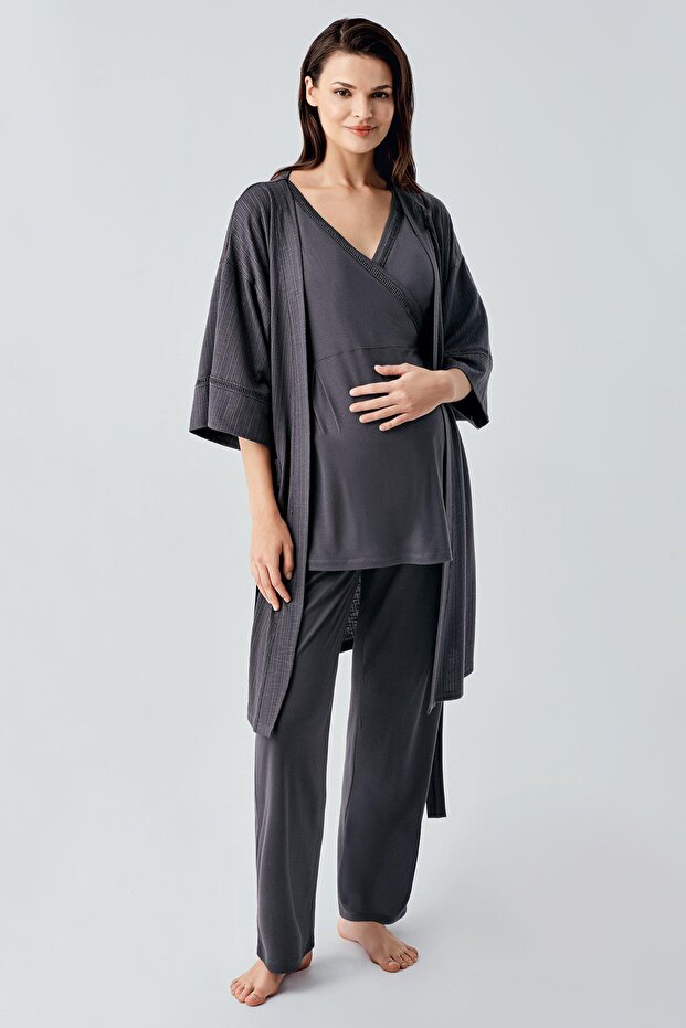 Artış Uzun Kollu Likralı Viskoz Hamile Gecelik Sabahlık Takım
