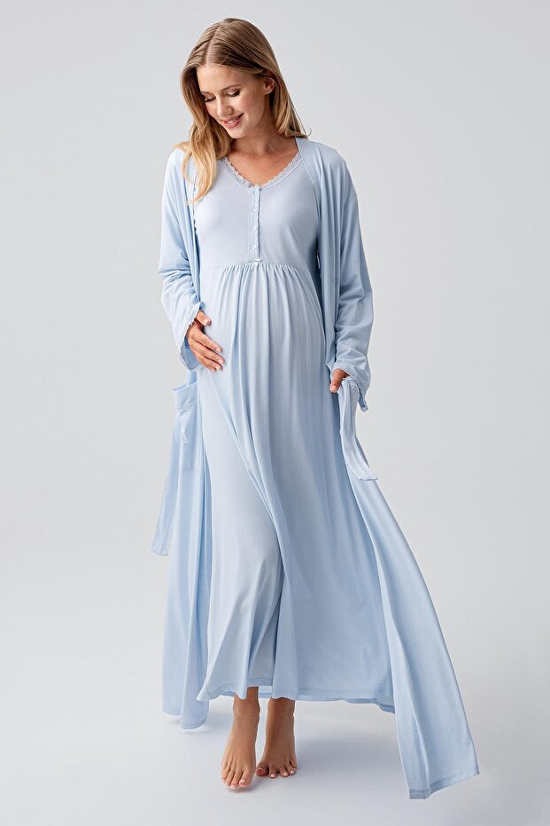 Artış Uzun Kollu Düğmeli Esnek Viskoz Hamile Sabahlık Gecelik Takım