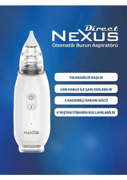 DİRECT NEXUS ELEKTRİKLİ BURUN VE KULAK ASPİRATÖRÜDİRECT NEXUS KALİTESİ VE DEVAMED GÜVENCESİ Ürün özellikleri- Yıkanabilir başlığı sayesinde yedek uç ihtiyacınız yok.- Yeni doğandan itibaren tüm yaşlara uygundur- USB kablo ile şarz edilebilir- Her yerde, her ortam kolayca kullabailirsiniz- 3 kademeli vakum gücü sayesinde her yaşa uygun- Herhangi bir yardımcı alet/aperat gerektirmez- Kulak temizeleme başlığı sayesinde bebeğinizin kulağını temizleyebilirsiniz- Akıllı şarz göstergesi