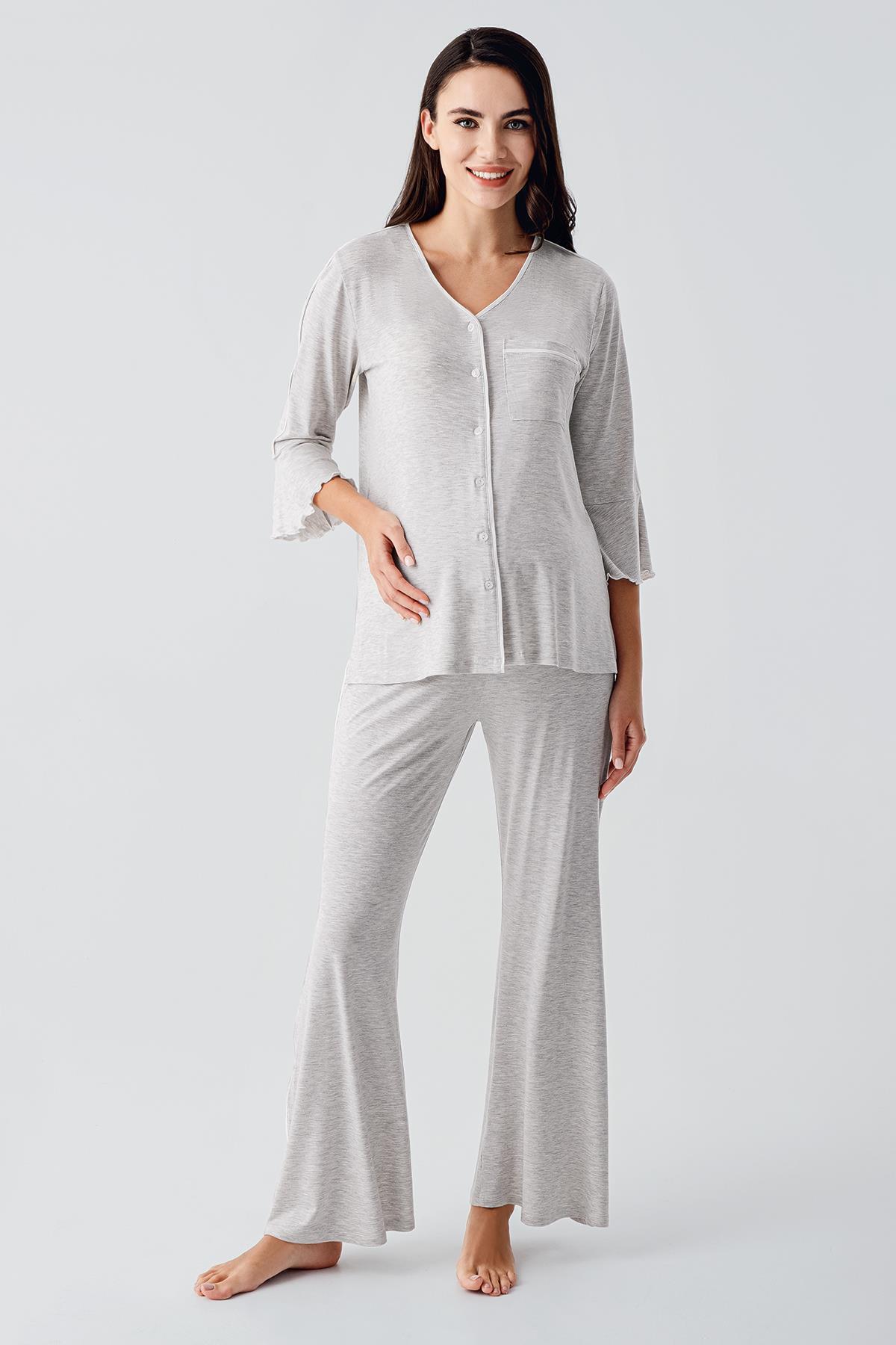 Düğmeli Uzun Kollu Kısa Esnek Viskoz Hamile Pijama Takımı