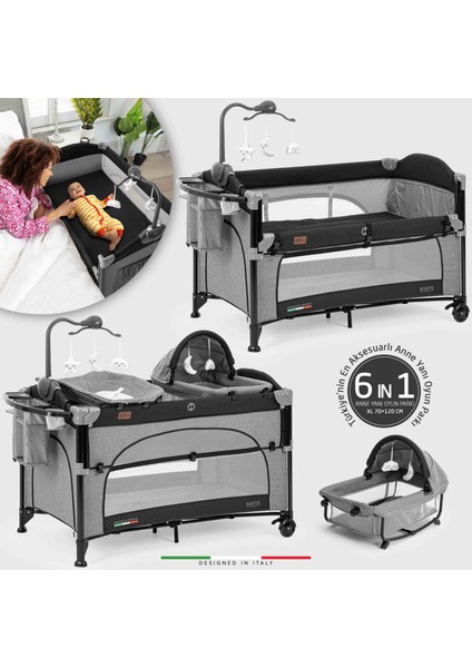 Elele Bonte 2 6in1 Lüks Anne Yanı Oyun Parkı Park Yatak XL 70x120 cm Gri-Siyah