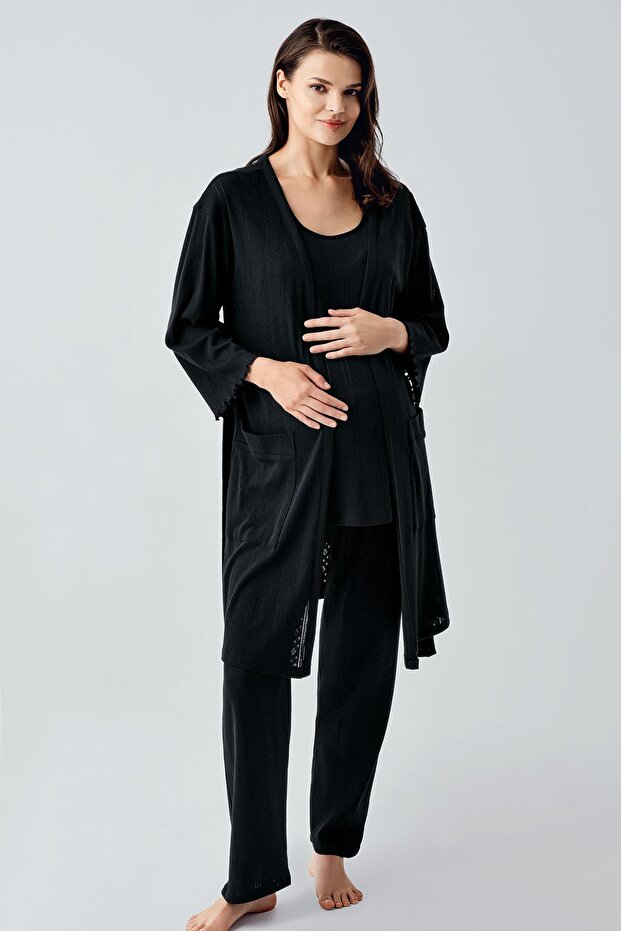 Kalın Askılı Ajurlu Esnek Pamuklu Hamile Sabahlık Pijama Takım