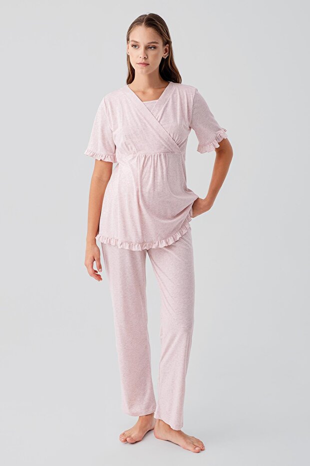 Kısa Kollu Emzirme Bölmeli Ayarlanabilir Bel Pamuklu Hamile Pijama Takım