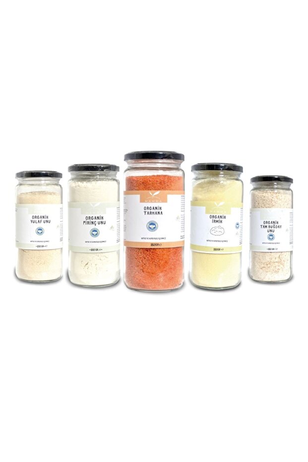 Set İçeriği: 1-Organik Tam Buğday Unu 250gr 2-Organik Tam Yulaf Unu 200gr 3-Organik Tam Pirinç Unu 300gr 4-Organik İrmik 330gr 5-Organik Tarhana 350gr Bu ürün T. C. 5262 sayılı Organik Tarım Kanunu,ilgili Organik Tarımın Esasları ve Uygulanmasına İlişkin Yönetmeliğe uygun olarak üretilmiştir.
