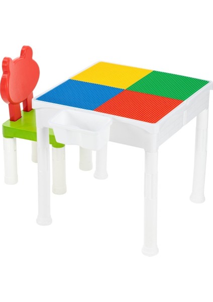 Masanın oyuncakları, inşaat parçalarını, kırtasiye malzemelerini veya diğer küçük eşyaları saklamak için harici cepleri vardır.