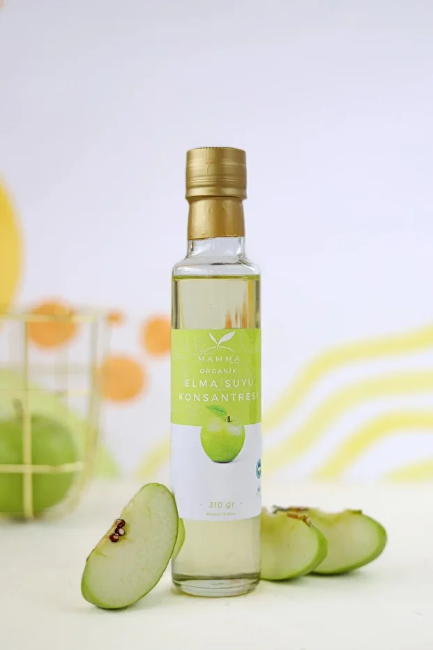İçindekiler: Organik elma suyu konsantresi Brix:69.35 Besin Değerleri/100 gr Enerji(kcal):322 Karbonhidrat:69.1 Protein:0.7 Şeker:67.2 Yağ:0.7 Doymuş Yağ:0 Vitamin C:6.3mg 1 Ölçü şeker yerine yarım ölçü elma suyu konsantresi kullanımı önerilir.