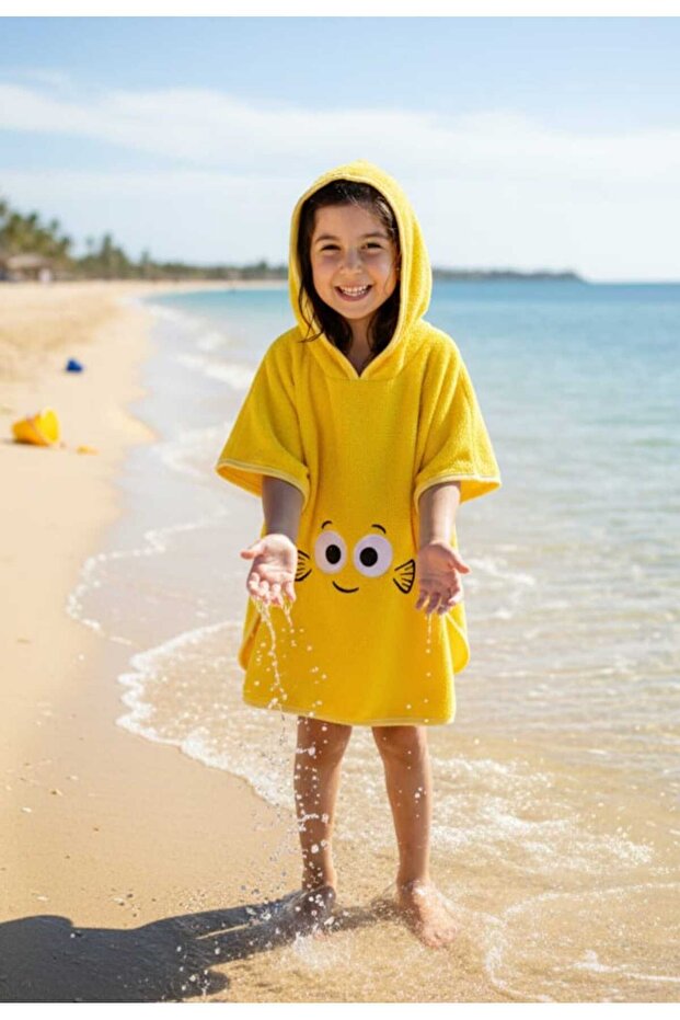 PAMUK HANIM Pamuklu yumuşacık Havlu Kız-erkek Çocuk Deniz Plaj, Havuz, banyo Kapşonlu Panço SARI /GÖZ