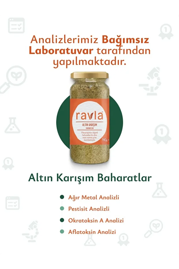 Ravla Altın Baharat Karışımı; zerdeçal, zencefil, tarçın, kakule, vanilya, Hindistan cevizi ve karabiber gibi özenle seçilmiş baharatlardan oluşur. Katkı maddesi içermez, tamamen doğal ve aromatik bir karışımdır.