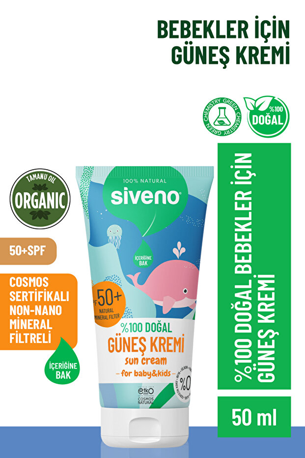 Siveno %100 Doğal Bebek Güneş Kremi Leke Karşıtı Antioksidan Nemlendirici Bitkisel UVA UVB SPF 50+ 50 ml