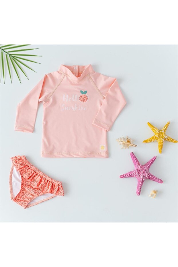 Bebek ve çocuklar için özel olarak tasarlanmış, plaj tekstil koleksiyonundan bir parça olan bu uzun kollu mayo seti, yaz aylarının vazgeçilmez beachwear ürünüdür