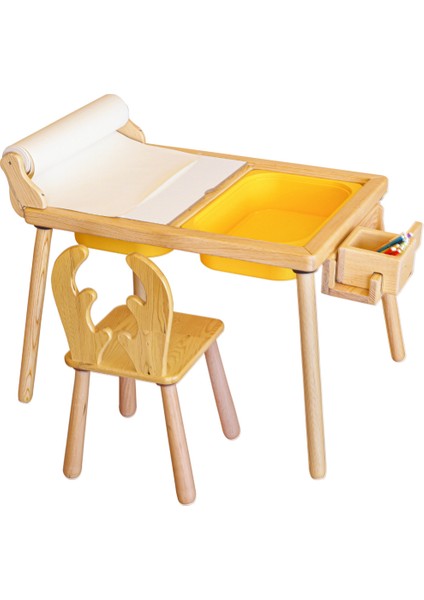 Woodnjoy Doğal Ahşap Duyusal Çocuk Aktivite Masası Oyun Masası ve Çocuk Çalışma Masası 1 Sandalye Seti(Rulo Aparalı ve Kırtasiye İstasyonlu)